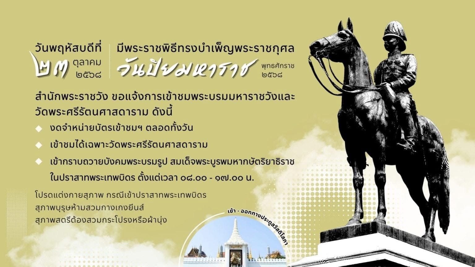 วันที่ ๒๓ ตุลาคม เป็นวันคล้ายวันสวรรคตของพระบาทสมเด็จพระจุลจอมเกล้าเจ้าอยู่หัว รัชกาลที่ ๕ โดยพระองค์ทรงมีพระมหากรุณาธิคุณอันยิ่งใหญ่ต่อประเทศไทยหลายด้าน และสิ่งที่โดดเด่นคือ การประกาศเลิกทาส เป็นการหยุดวงจรการเป็นทาส เพราะเมื่อสมัยก่อนหากพ่อแม่เป็นทาส ลูกที่เกิดมาก็ต้องเป็นทาสต่อไปเรื่อยๆ ทางราชการจึงได้ประกาศให้วันที่ ๒๓ ตุลาคมของทุกปีเป็นหนึ่งในวันระลึกถึงความสำคัญของเหตุการณ์ในชาติ โดยเรียกว่า “วันปิยมหาราช” พร้อมทั้งกำหนดให้วันนี้เป็นวันหยุดราชการ