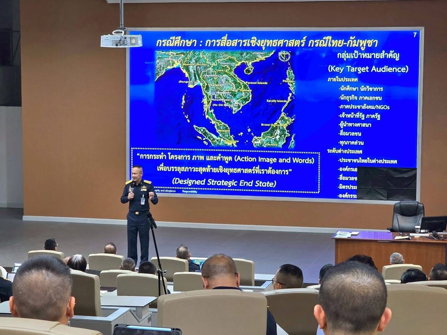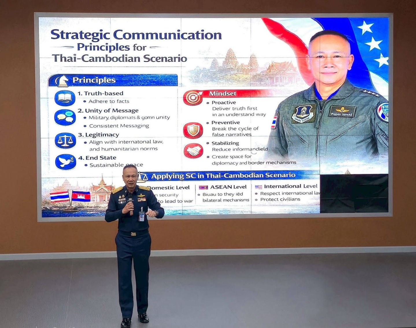 หลักการสื่อสารเชิงยุทธศาสตร์ การสื่อสารของไทยยึด 4 หลักสำคัญ ได้แก่ Truth-Based – Unity of Message – Legitimacy – End-State Focus โดยเน้นความจริง ความเป็นเอกภาพ ความชอบธรรมตามกฎหมายระหว่างประเทศ และมุ่งสู่สันติภาพที่ยั่งยืน