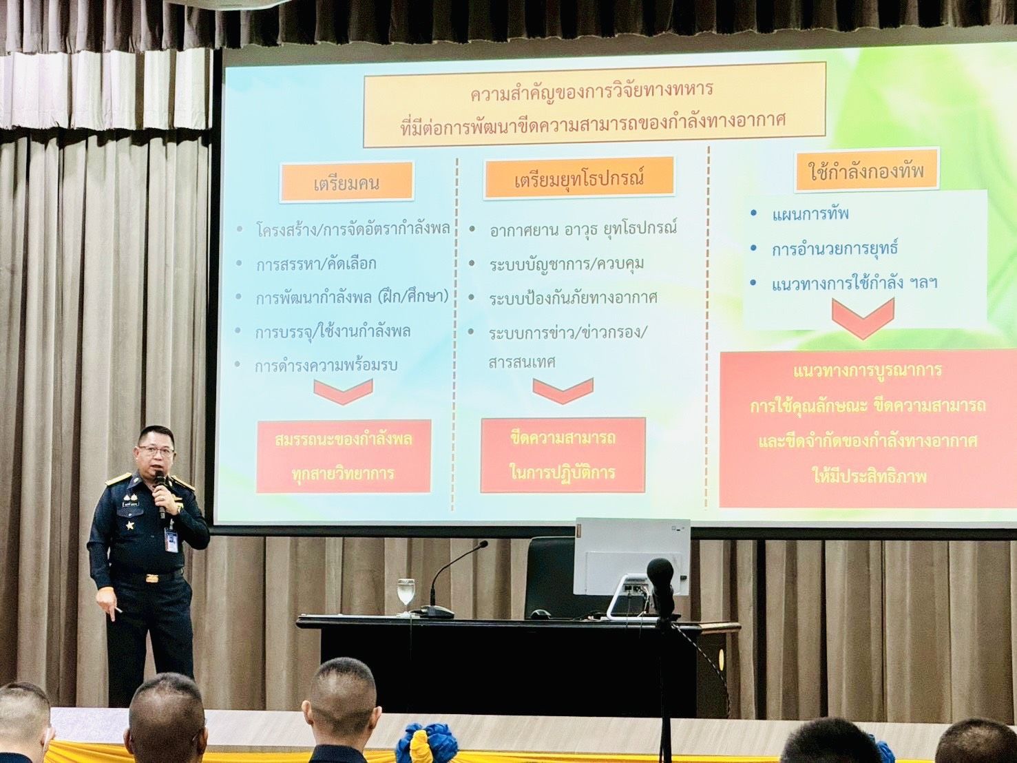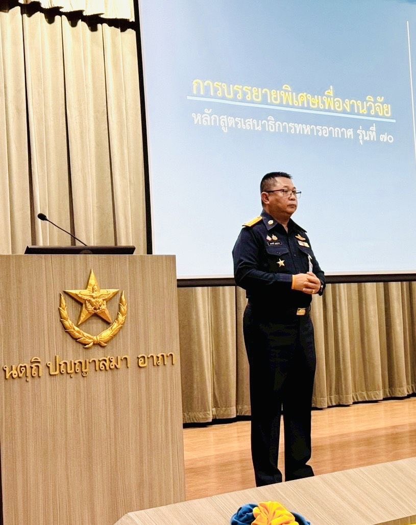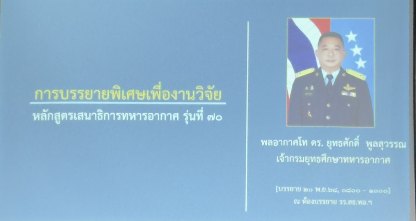 พลอากาศโท ยุทธศักดิ์ พูลสุวรรณ เจ้ากรมยุทธศึกษาทหารอากาศ ให้เกียรติบรรยายพิเศษหลักสูตรเสนาธิการทหารอากาศ รุ่นที่ ๗๐ ในหัวข้อด้านงานวิจัยแก่นักศึกษาหลักสูตรเสนาธิการทหารอากาศ รุ่นที่ ๗๐ เมื่อวันศุกร์ที่ ๒๑ พฤศจิกายน ๒๕๖๘ ณ ห้องบรรยาย โรงเรียนเสนาธิการทหารอากาศ กรมยุทธศึกษาทหารอากาศ ในปีการศึกษานี้ มีผู้เข้ารับการศึกษาทั้งสิ้น ๑๐๒ คน ประกอบด้วยข้าราชการสังกัดกระทรวงกลาโหม สำนักงานตำรวจแห่งชาติ และนักศึกษาจากประเทศมิตรประเทศ การบรรยายดังกล่าวมีวัตถุประสงค์เพื่อเสริมสร้างความรู้ ความเข้าใจเกี่ยวกับกระบวนการวิจัยทางทหารในหลากหลายมิติ ซึ่งถือเป็นพื้นฐานสำคัญในการสร้างองค์ความรู้ใหม่และพัฒนาผลงานวิจัยเชิงยุทธการของนักศึกษาในอนาคต ทั้งยังเป็นโอกาสสำคัญในการถ่ายทอดประสบการณ์ด้านงานวิจัยระหว่างผู้เข้ารับการศึกษา อันจะนำไปสู่การเสริมสร้างศักยภาพและความพร้อมในการพัฒนาผลงานวิจัยระดับยุทธการต่อไป