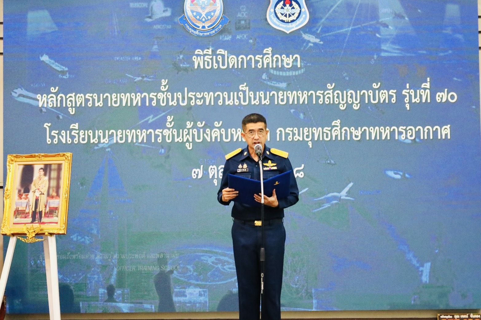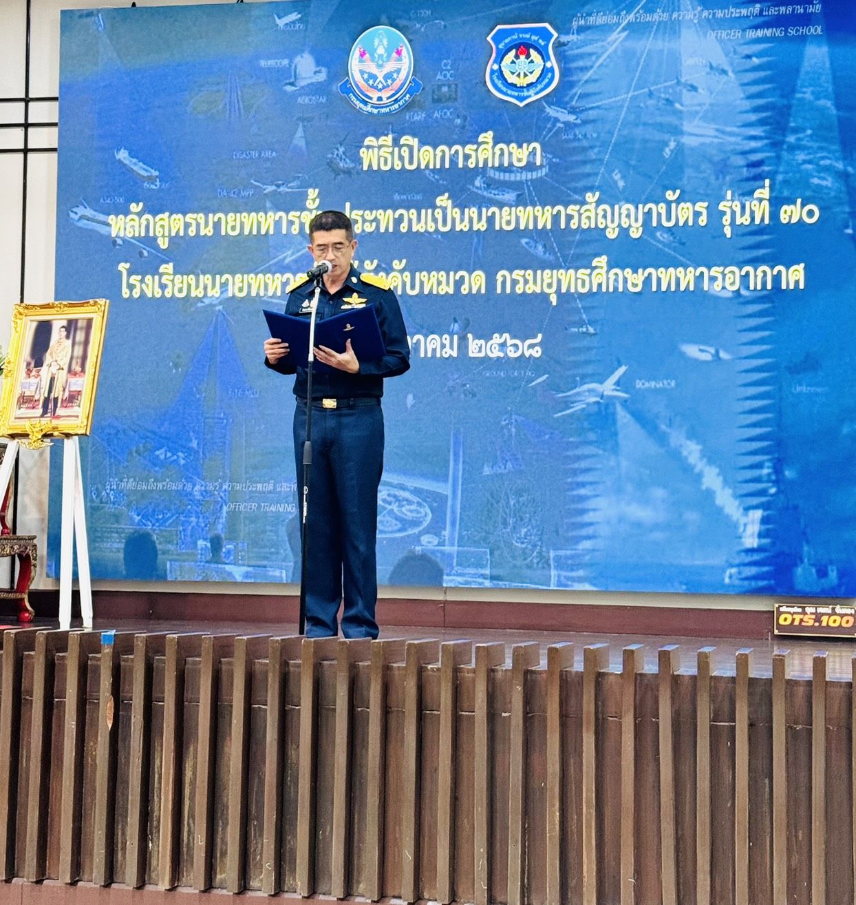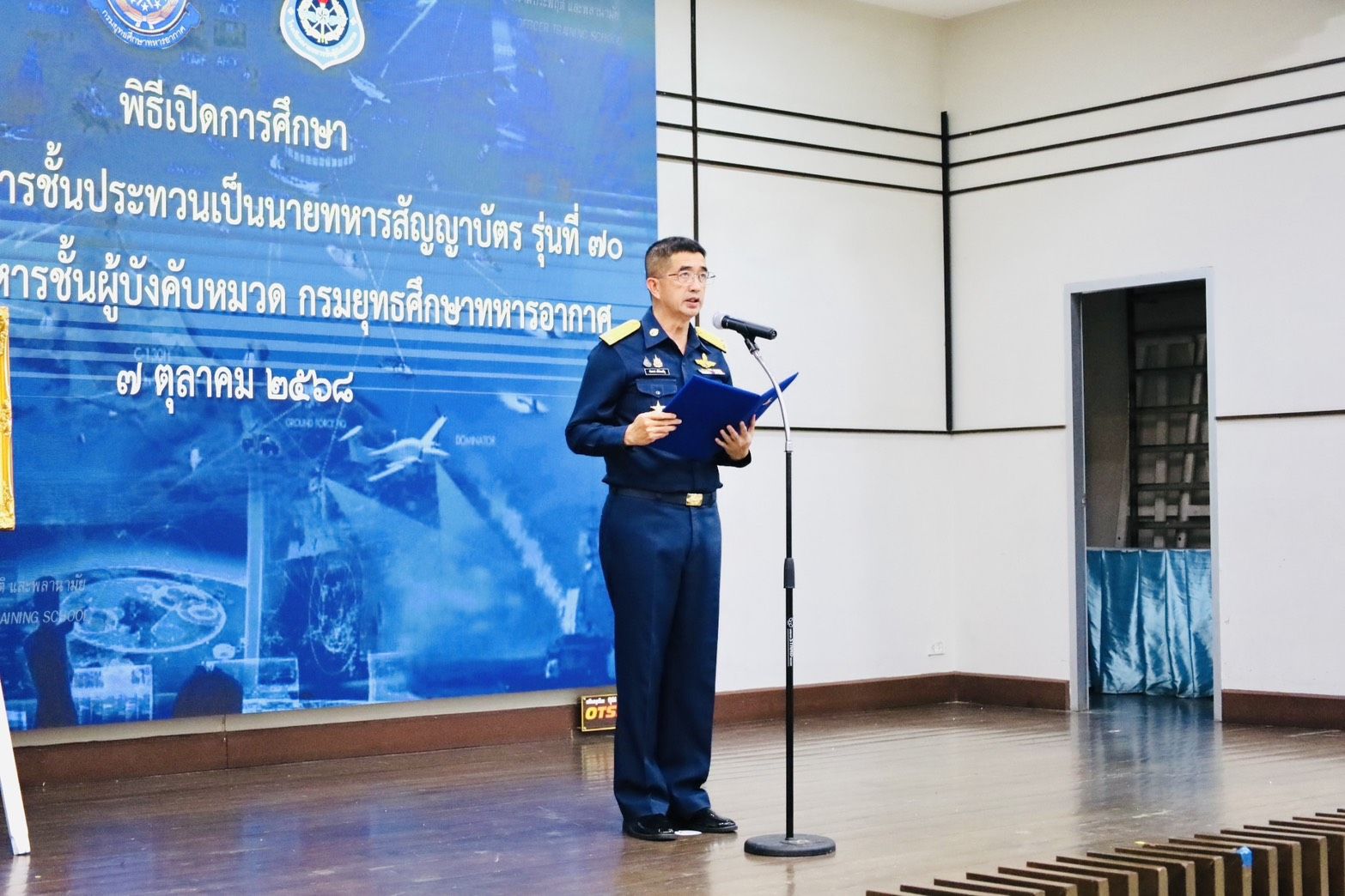 พลอากาศตรี ประภาส ศรีประเสริฐ รองเจ้ากรมยุทธศึกษาทหารอากาศ (สายงานการศึกษา) เป็นประธานในพิธีเปิดการอบรมหลักสูตรนายทหารประทวนเป็นนายทหารสัญญาบัตร รุ่นที่ ๗๐ พร้อมทั้งให้โอวาท หลักสูตรนายทหารประทวนเป็นนายทหารสัญญาบัตร เป็นหลักสูตรเบื้องต้นที่สำคัญ ของการก้าวเข้าสู่ชีวิตนายทหารชั้นสัญญาบัตร การได้รับคัดเลือกให้เข้ารับการอบรมในหลักสูตรนี้ จึงเป็นโอกาสที่น่ายินดีและภาคภูมิใจ ของผู้เข้ารับการอบรมทุกท่าน ดังนั้นจึงขอให้ผู้เข้ารับการอบรม มีความกระตือรือร้น มุ่งมั่น ตั้งใจศึกษาหาความรู้ ที่ทางโรงเรียนจะมอบให้รวมทั้งประพฤติปฏิบัติตนให้เป็นไปตามระเบียบข้อบังคับของโรงเรียนและวินัยทหารอย่างเคร่งครัด หลักสูตรนายทหารประทวนเป็นนายทหารสัญญาบัตร รุ่นที่ ๗๐ เปิดอบรมระหว่างวันที่ ๗ ตุลาคม ๒๕๖๘ ถึงวันที่ ๒๒ ตุลาคม ๒๕๖๘ มีระยะเวลาอบรมประมาณ ๓ สัปดาห์ โดยมีผู้เข้ารับการอบรม เป็นข้าราชการชั้นยศพันจ่าอากาศเอก สังกัดกองทัพอากาศ จำนวน ๘๖ คน เมื่อวันอังคารที่ ๗ ตุลาคม ๒๕๖๘ ๐๙๐๐ ณ ห้องบรรยาย โรงเรียนนายทหารชั้นผู้หมวด กรมยุทธศึกษาทหารอากาศ