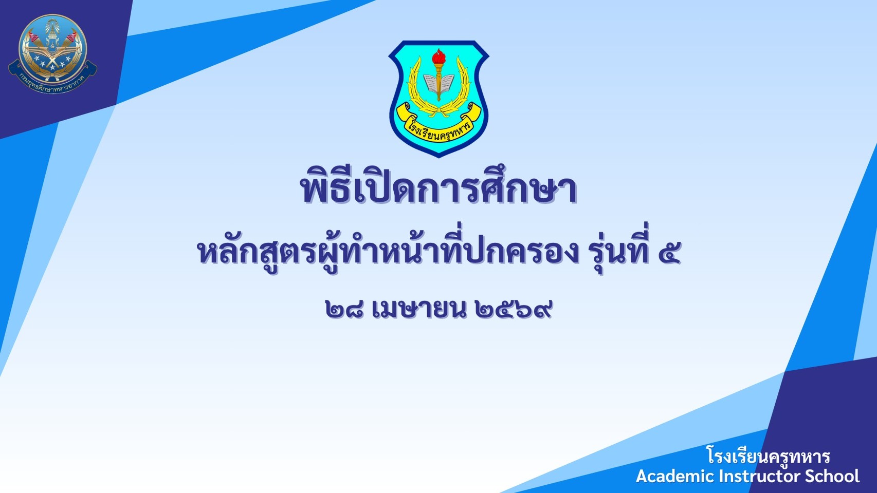 พลอากาศตรี ประภาส ศรีประเสริฐ รองเจ้ากรมยุทธศึกษาทหารอากาศ (สายงานการศึกษา) เป็นประธานพิธีเปิดการศึกษาหลักสูตรผู้ทำหน้าที่ปกครองชั้นสัญญาบัตร รุ่นที่ ๕ และหลักสูตรผู้ทำหน้าที่ปกครองชั้นประทวน รุ่นที่ ๕ พร้อมทั้งขอแสดงความยินดี และขอต้อนรับผู้เข้ารับการศึกษา หลักสูตรผู้ทำหน้าที่ปกครองชั้นสัญญาบัตร รุ่นที่ ๕ และหลักสูตรผู้ทำหน้าที่ปกครอง ชั้นประทวน รุ่นที่ ๕ หลักสูตรนี้มีความมุ่งหมาย เพื่อให้ผู้เข้ารับการศึกษา มีความรู้และความสามารถ ในการปฏิบัติงานปกครองบังคับบัญชา ปลูกฝังอุดมการณ์ อุปนิสัย กำกับดูแลความเป็นอยู่ของผู้เข้ารับการฝึกศึกษา ในสถาบันการศึกษาเหล่านั้น ดังนั้นผู้เข้ารับการศึกษาทุกคน จะต้องมีความกระตือรือร้น จงมุ่งมั่นตั้งใจศึกษาแสวงหาความรู้ ที่ทางโรงเรียนจะมอบให้ รวมทั้งจะต้องประพฤติปฏิบัติตน ให้เป็นไปตามระเบียบข้อบังคับของโรงเรียน และวินัยทหารอย่างเคร่งครัด เมื่อวันอังคารที่ ๒๘ เมษายน ๒๕๖๙ เวลา ๐๙๐๐ ณ ห้องกิจกรรม โรงเรียนครูทหาร กรมยุทธศึกษาทหารอากาศ