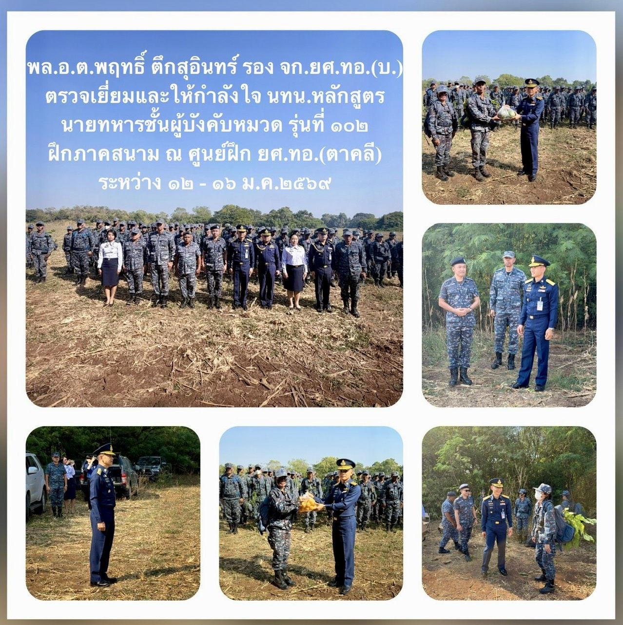 พลอากาศตรี พฤทธิ์ ตึกสุอินทร์ รองเจ้ากรมยุทธศึกษาทหารอากาศ (สายงานบริหาร) พร้อมคณะเดินทางไปตรวจเยี่ยมและให้กำลังใจ นายทหารนักเรียนหลักสูตรนายทหารชั้นผู้บังคับหมวด รุ่นที่ ๑๐๒ ฝึกภาคสนาม ณ ศูนย์ฝึก กรมยุทธศึกษาทหารอากาศ (ตาคลี) ระหว่างวันที่ ๑๒ - ๑๖ มกราคม ๒๕๖๙