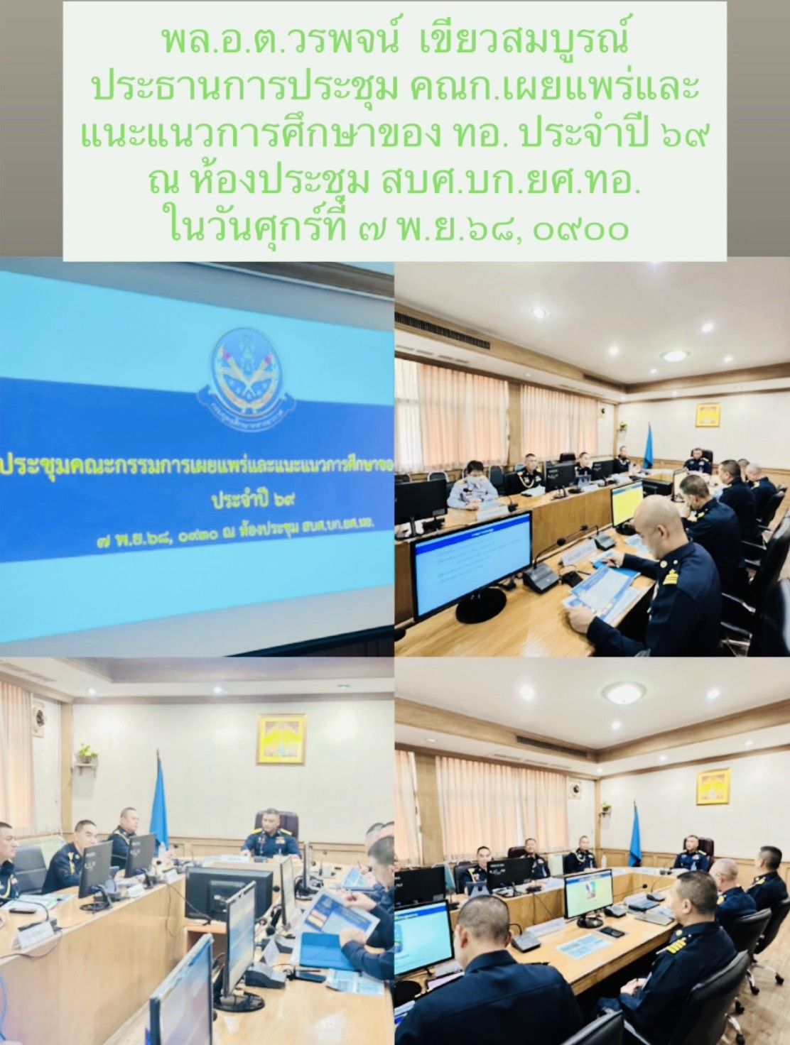 พลอากาศตรี วรพจน์ เขียวสมบูรณ์ เสนาธิการกรมยุทธศึกษาทหารอากาศ เป็นประธานการประชุมคณะกรรมการเผยแพร่และแนะแนวการศึกษาของกองทัพอากาศ ประจำปี ๒๕๖๙ เพื่อวางแผนการดำเนินการเผยแพร่และแนะแนวการศึกษาของ กองทัพอากาศ เป็นไปด้วยความเรียบร้อย มีประสิทธิภาพ สมความมุ่งหมายของทางราชการ เมื่อวันศุกร์ที่ ๗ พฤศจิกายน ๒๕๖๘ เวลา ๐๙๓๐ ณ ห้องประชุมสำนักบริหารการศึกษา กรมยุทธศึกษาทหารอากาศ
