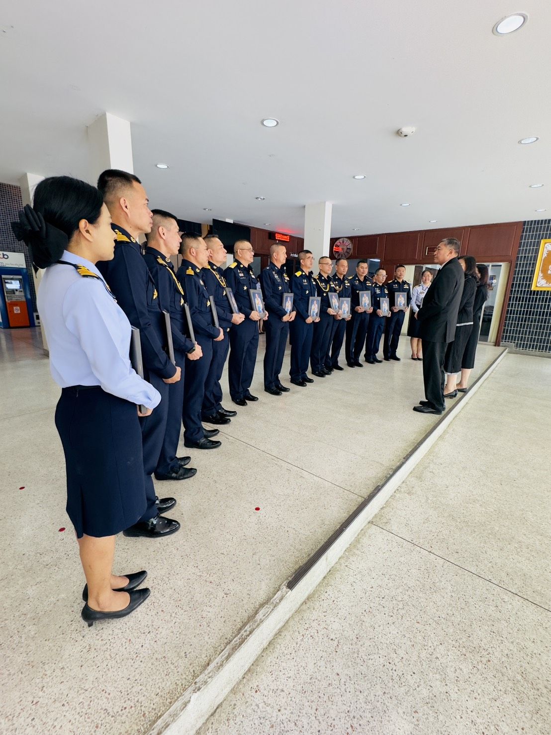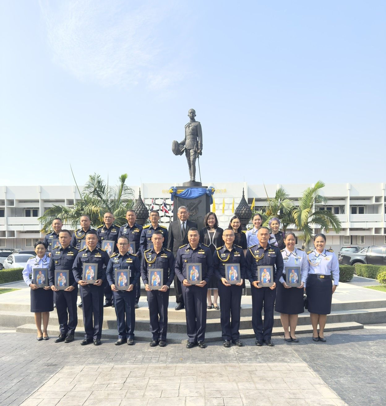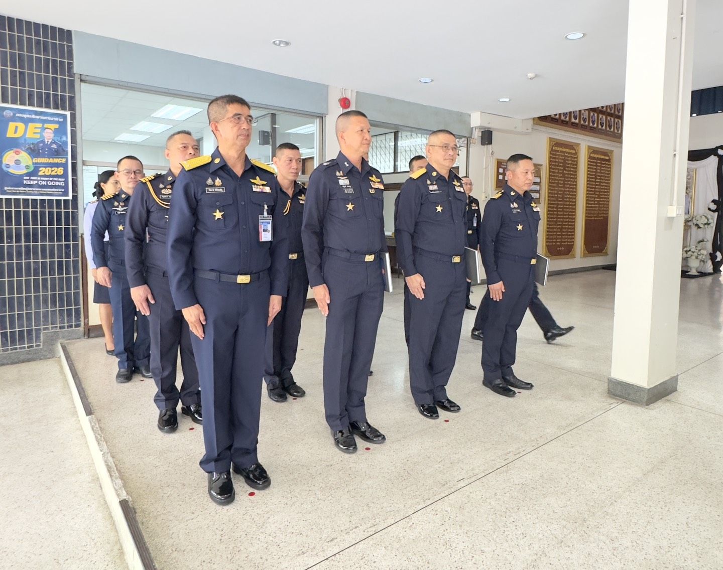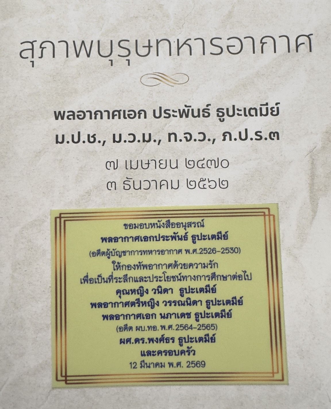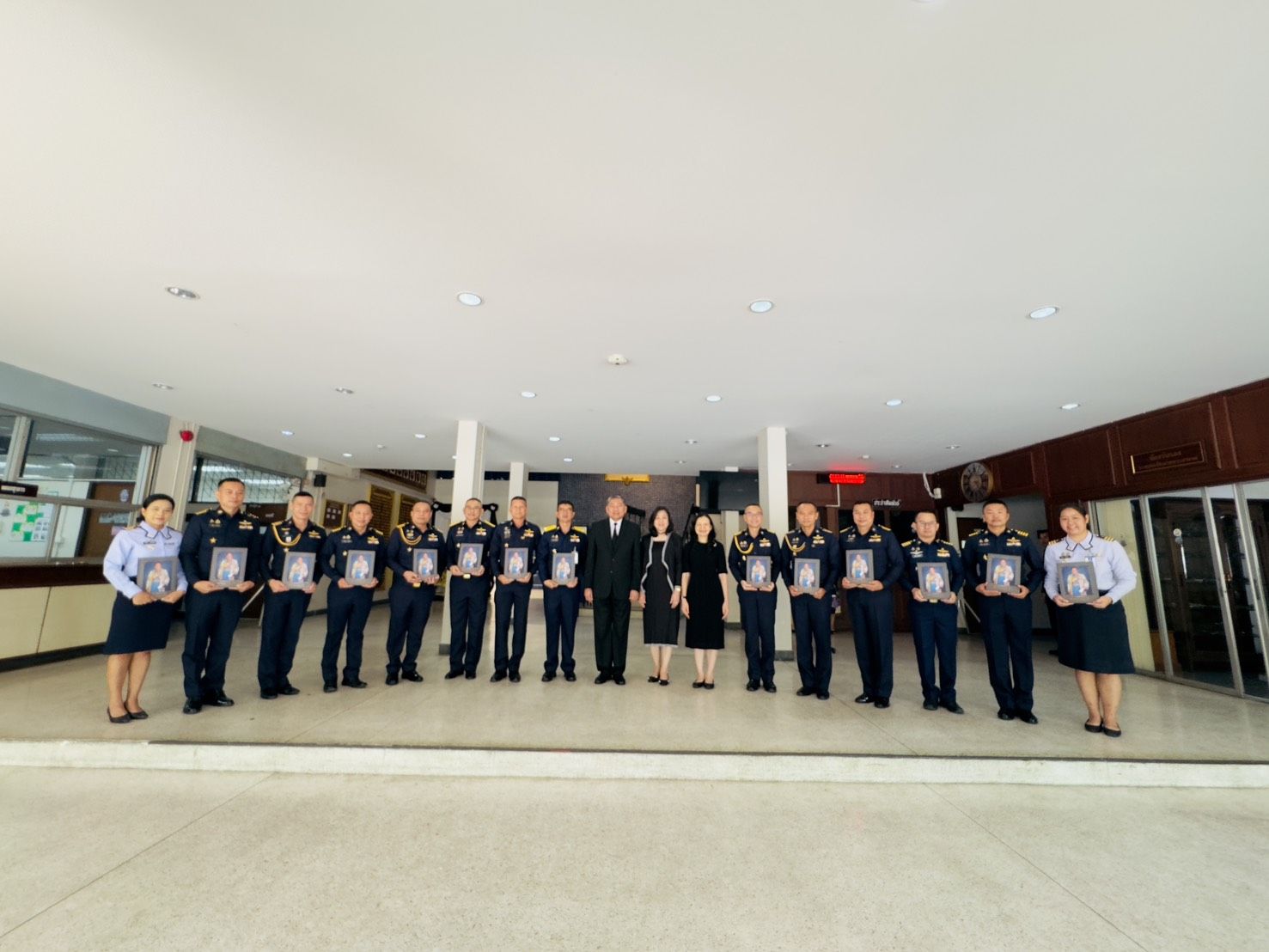 พลอากาศตรี ประภาส ศรีประเสริฐ รองเจ้ากรมยุทธศึกษาทหารอากาศ (สายงานการศึกษา) พร้อมคณะผู้บังคับบัญชา หัวหน้าหน่วยขึ้นตรง กรมยุทธศึกษาทหารอากาศ ให้การต้อนรับ พลอากาศเอก นภาเดช ธูปเตมีย์ และ พลอากาศตรีหญิง พันธ์นิดา ณ ลำปาง มอบหนังสือ (สุภาพบุรุษทหารอากาศ) เมื่อวันพฤหัสบดี ๑๒ มีนาคม ๒๕๖๙ ณ ห้องรับรอง ชั้น ๑ กองบัญชาการ กรมยุทธศึกษาทหารอากาศ