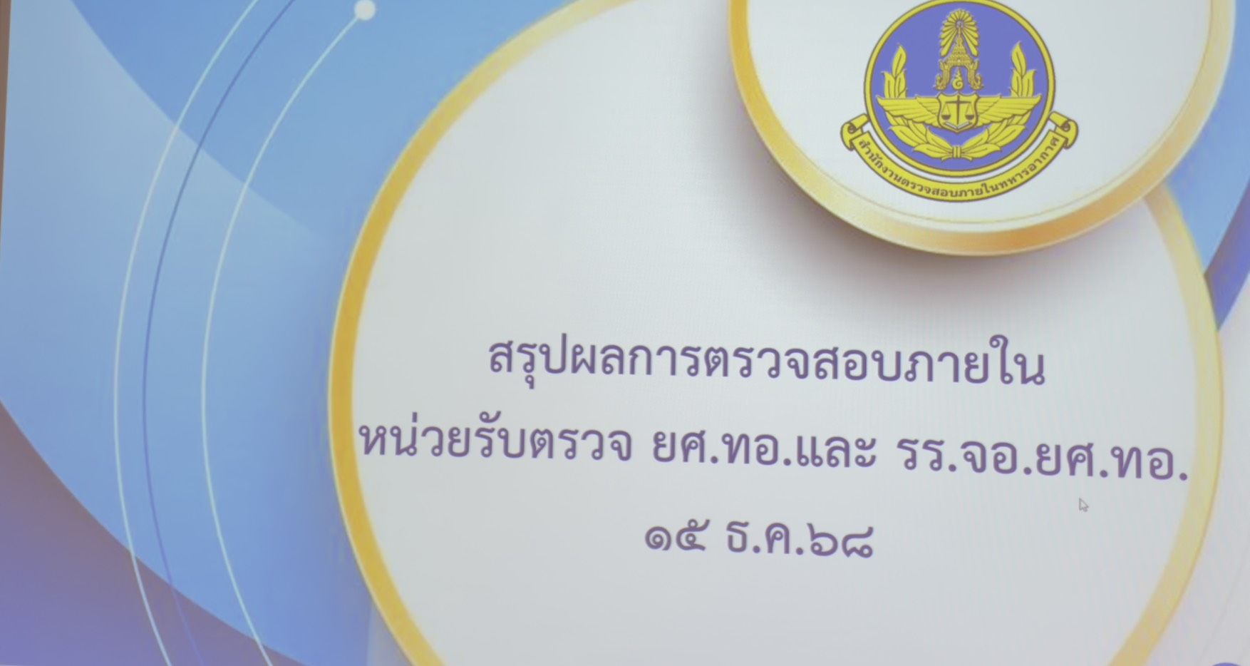 ปิดการตรวจสอบ ภายในประจำปีงบประมาณ ๒๕๖๙ กรมยุทธศึกษาทหารอากาศ ตามแผนการตรวจสอบภายในประจำปีงบประมาณ ๒๕๖๙ ณ ห้องประชุม กองบัญชาการกรมยุทธศึกษาทหารอากาศ เมื่อวันจันทร์ที่ ๑๕ ธันวาคม ๒๕๖๘