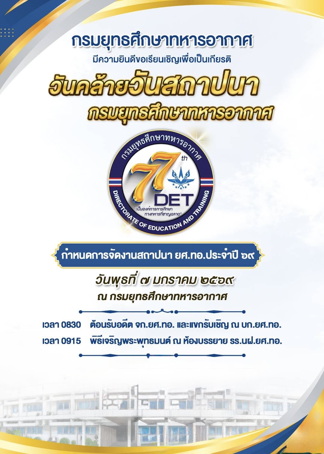 พลอากาศโท ยุทธศักดิ์ พูลสุวรรณ เจ้ากรมยุทธศึกษาทหารอากาศ เป็นประธานในพิธีวันคล้ายวันสถาปนา กรมยุทรศึกษาทหารอากาศครบรอบ ๗๗ ปี โดยมีกำหนดการดังนี้ ต้อนรับอดีตเจ้ากรมยุทรศึกษาทหารอากาศและแขกรับเชิญ ณ ห้องโถงและห้องรับรอง กองบัญชาการกรมยุทธศึกษาทหารอากาศ, พิธีเจริญพระพุทธมนต์ ณ ห้องบรรยาย โรงเรียนนายทหารชั้นผู้บังคับฝูง กรมยุทธศึกษาทหารอากาศ, พิธีฟังสารผู้บัญชาการทหารอากาศเนื่องในวันคล้ายวันสถาปนากรมยุทธศึกษาทหารอากาศ ครบรอบ ๗๗ ปี พิธีมอบโล่และใบประกาศเกียรติคุณ บุคคลดีเด่น ประจำปี ๒๕๖๘ และได้กล่าวปิดงาน วันคล้ายวันสถาปนาครบรอบ ๗๗ ปี กรมยุทธศึกษาทหารอากาศ ความว่า