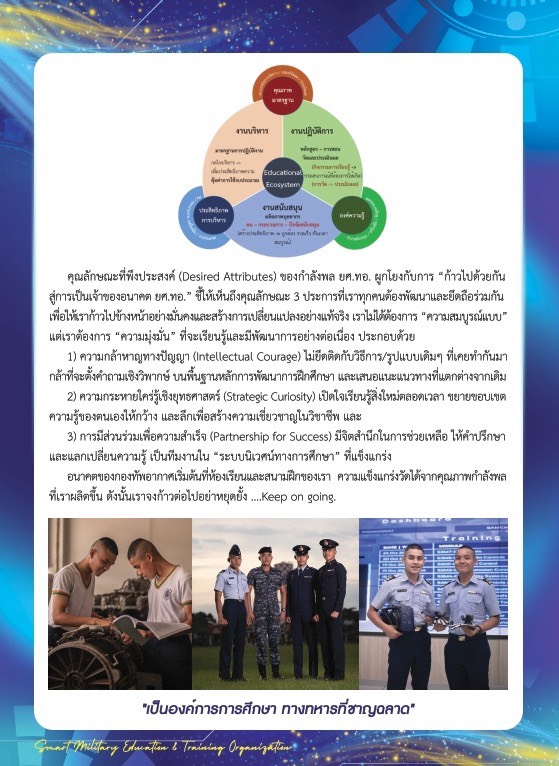 "๗๗ ปี ยศ.ทอ. ก้าวต่อไปบนฐานรากที่มั่นคง" กราบเรียน อดีตเจ้ากรมยุทธศึกษาทหารอากาศ ผู้เป็นต้นแบบและที่เคารพ รักทุกท่าน ผู้บริหารสถานศึกษารอบที่ตั้งฐานทัพอากาศ หัวหน้าหน่วยขึ้นตรง และ ข้าราชการ กรมยุทธศึกษาทหารอากาศ ทุกนาย ก่อนอื่นผมขอแสดงความยินดี และชื่นชมกับคนคุณภาพที่ได้รับโล่ และใบประกาศเกียรติคุณ อันเป็นผลมาจากความเสียสละ มุ่งมั่น ตั้งใจในการปฏิบัติภารกิจ สามารถสร้างผลงานเป็นที่โดดเด่นเป็นที่ประจักษ์จนได้รับ คัดเลือกเป็นบุคคลดีเด่นของหน่วยขึ้นตรง และของกรมยุทธศึกษาทหารอากาศในครั้งนี้ในโอกาสครบรอบ ๗๗ ปี กรมยุทธศึกษาทหารอากาศ ผมอยากให้พวกเรามองไปรอบๆ ห้องนี้เรามีอดีตผู้บังคับบัญชา ที่เคยตรากตรำวางรากฐานไว้ให้เรา สิ่งที่เรากำลัง "เก็บเกี่ยว" และใช้ประโยชน์อยู่ในทุกวันนี้ไม่ว่าจะเป็นระบบการศึกษาที่เข้มแข็ง หรือเกียรติภูมิของหน่วยงาน ล้วนเป็นผลผลิต จากวิสัยทัศน์และความเสียสละของท่านเหล่านั้นที่ส่งมอบต่อกันมาภารกิจของเรานับต่อจากนี้ คือการ "ก้าวต่อไป" บนความรับผิดชอบที่ใหญ่ขึ้นผมขอให้คำมั่น และเน้นย้ำประเด็นสำคัญ ๓ ประการ ที่เราจะร่วมกันเสริมสร้างให้เข้มแข็งยิ่งขึ้นต่อจากนี้ ประการแรก คือ "คุณภาพและมาตรฐาน" การฝึกศึกษาของเรา ต้องไม่ใช่แค่การสอนตามตำราแต่ต้องเป็นการสร้างสมรรถนะที่จับต้องได้จริงมาตรฐานของ กรมยุทธศึกษาทหารอากาศ จะต้องเป็นที่ยอมรับทั้งในระดับกองทัพและในระดับสากล เพื่อให้มั่นใจว่า กำลังพลทุกนายที่ผ่านเราไปคือ "อาวุธทางปัญญา" ที่พร้อมปฏิบัติภารกิจได้ทันที่ ประการที่สอง คือ "ประสิทธิภาพการบริหาร" เราต้องกล้าที่จะปฏิรูปการบริหารจัดการการศึกษา ให้มีความคล่องตัว ทันสมัย และนำเทคโนโลยีมาใช้ลดขั้นตอนที่ไม่จำเป็น เพื่อให้ครู อาจารย์ และนายทหารนักเรียน มีเวลาและพื้นที่ในการสร้างสรรค์นวัตกรรมใหม่ๆได้อย่างเต็มที่ และประการสุดท้าย คือ "การสร้างองค์ความรู้แห่งยุทธศึกษา" เราจะเป็น "Think Tank"หรือ"ศูนย์กลางการเรียนรู้ วิทยาการทางทหาร ของกองทัพอากาศ ความรู้ที่เราสร้างขึ้นในวันนี้จะต้องเป็นเข็มทิศนำทางที่ช่วยให้กองทัพอากาศพร้อมรับมือต่อภัยคุกคามในวันหน้า เพื่อนร่วมงานทุกท่านสิ่งที่ผมได้บอกพวกเราไป มันยาก มันท้าทายแต่มันก็มีทางที่เป็นไปได้ในวันใดวันหนึ่ง ผมจึงเน้นให้เรายึดถือแนวทาง "One foot in front of the next" หรือการก้าวไปข้างหน้าทีละก้าวอย่างมั่นคง เราไม่จำเป็นต้องก้าวกระโดดจนเสียสมดุล แต่เราจะไม่หยุดเดินแม้ก้าวเดียว การก้าวไปข้างหน้าในวันนี้ คือการนำสิ่งดีๆที